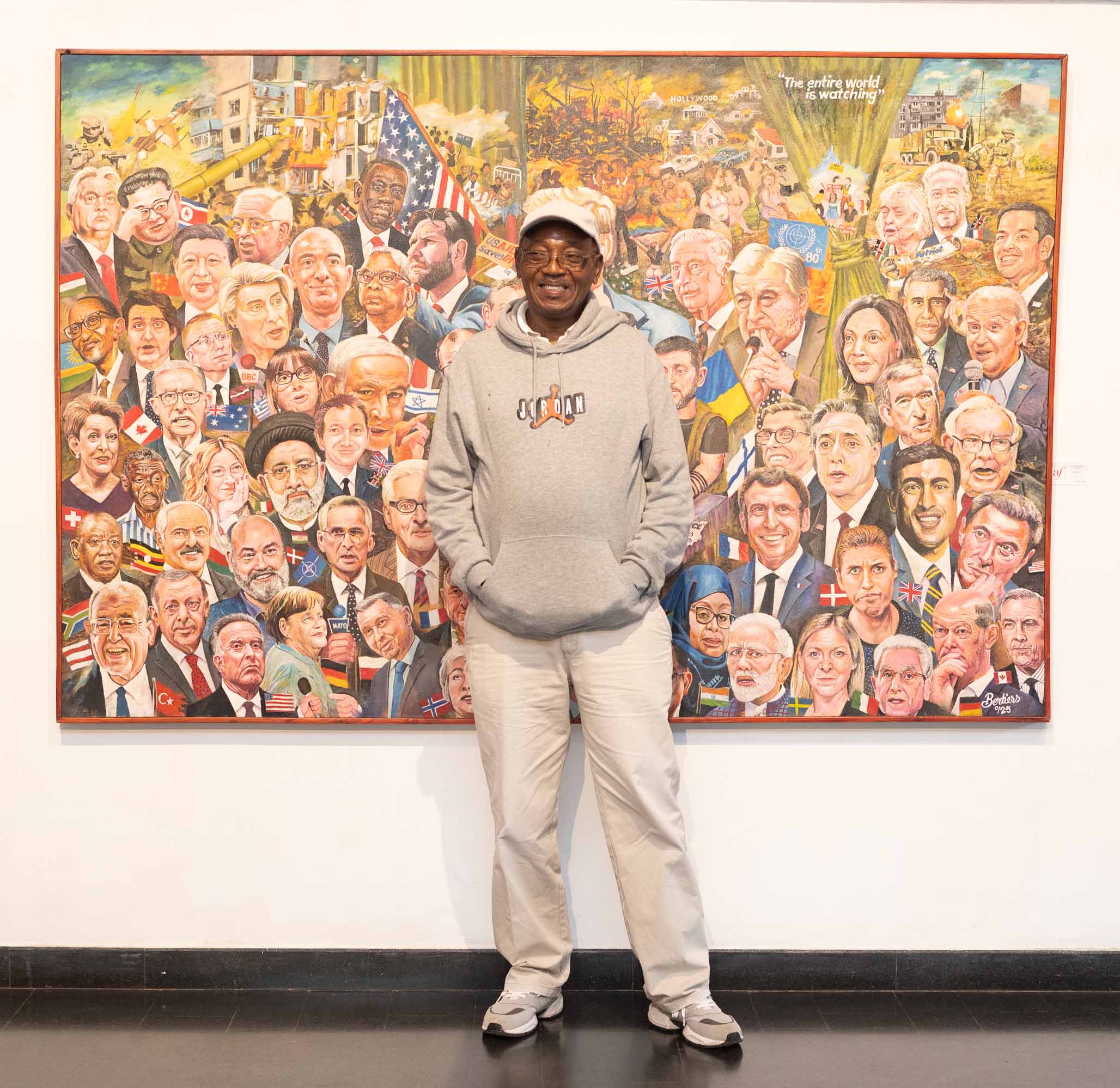 Bertiers is an all-round artist and an avid consumer of both local and international news, which continually fuels his creativity. In works such as The Entire World is Watching, he highlights global issues, including the Russia-Ukraine war, the Israel-Palestine conflict, and America’s superpower status—pointing out the irony of the world looking up to the U.S. while it grapples with pressing domestic issues such as the Los Angeles fires, gun violence, black lives matter, and ongoing debates around LGBTQI rights.